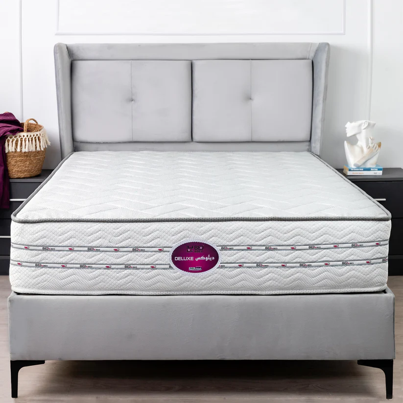 Economical mattress made of luxurious fabric manufactured from the finest threads. It is stitched with a layer of virgin thermal fiber and a layer of high-density sponge on both sides. The mattress contains a chassis made of connected springs, consisting of 130 springs per square meter made of treated steel, surrounded by a 5mm wire from all directions to provide cohesion and strength to the chassis. It is covered with layers of moisture-resistant felt and layers of 26-density sponge on both sides, with each layer being 3cm thick. The mattress is manufactured using the finest automated production lines in the German fashion, with the addition of high-density sponge strips around the perimeter of the mattress, secured with imported