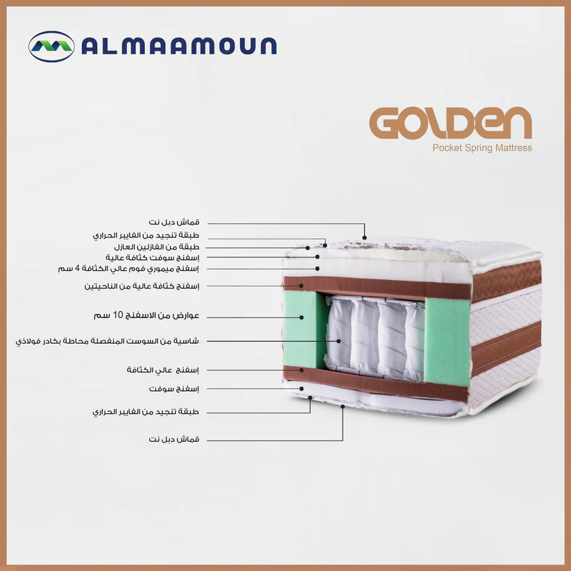 The mattress contains a chassis of pocket springs consisting of 260 springs per square meter almost made of treated steel, with a height of 18 cm, surrounded by a 5 mm wire from all directions to provide cohesion and strength to the chassis. It is covered with layers of non-woven fabric, moisture-insulating felt, and 4 cm thickness 30 from top side and sponge layers 2 cm thickness 26 from lower side . And 5 cm a layer of imported natural latex is added to it, and it is integrated with the mattress on the top side in Box top away .