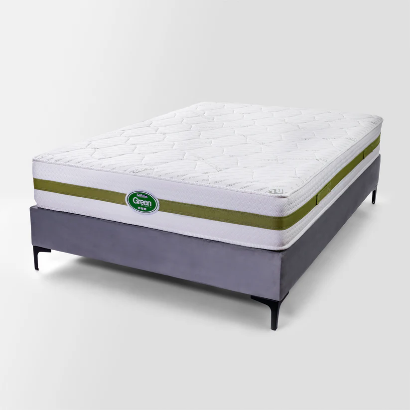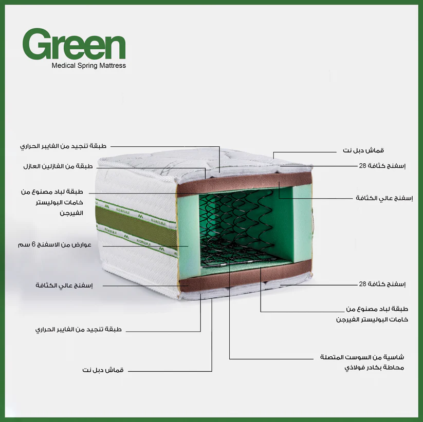 The mattress consists of luxurious fabric manufactured from the finest threads. It is stitched with a layer of virgin thermal fiber and two layers of high-density sponge on each side. The mattress contains a chassis made of connected springs, consisting of 200 springs per square meter almost made of treated steel, surrounded by a 5mm wire from all directions to provide cohesion and strength to the chassis. This chassis is manufactured using a unique technique and a large number of strong springs with high pressure. It is covered with layers of moisture-resistant felt and layers of 28-density sponge on both sides, with each layer being 3cm thick. The mattress is manufactured using the finest automated production lines in the German fashion, with the addition of high-density sponge strips around the perimeter of the mattress, secured with imported HOTMELT materials for durability and greater comfort.