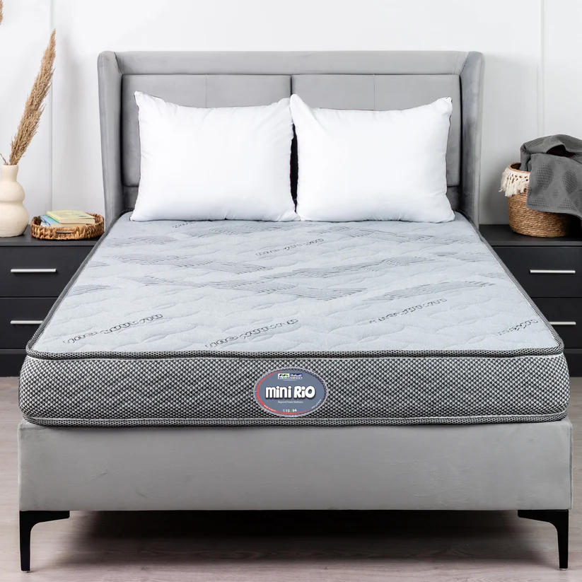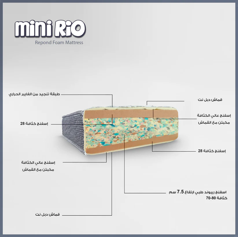 The Mini Rio mattress is made of compressed sponge (rebound). It is made of luxurious fabric manufactured from the finest threads and stitched with a layer of virgin thermal fiber and a layer of high-density sponge on both sides.