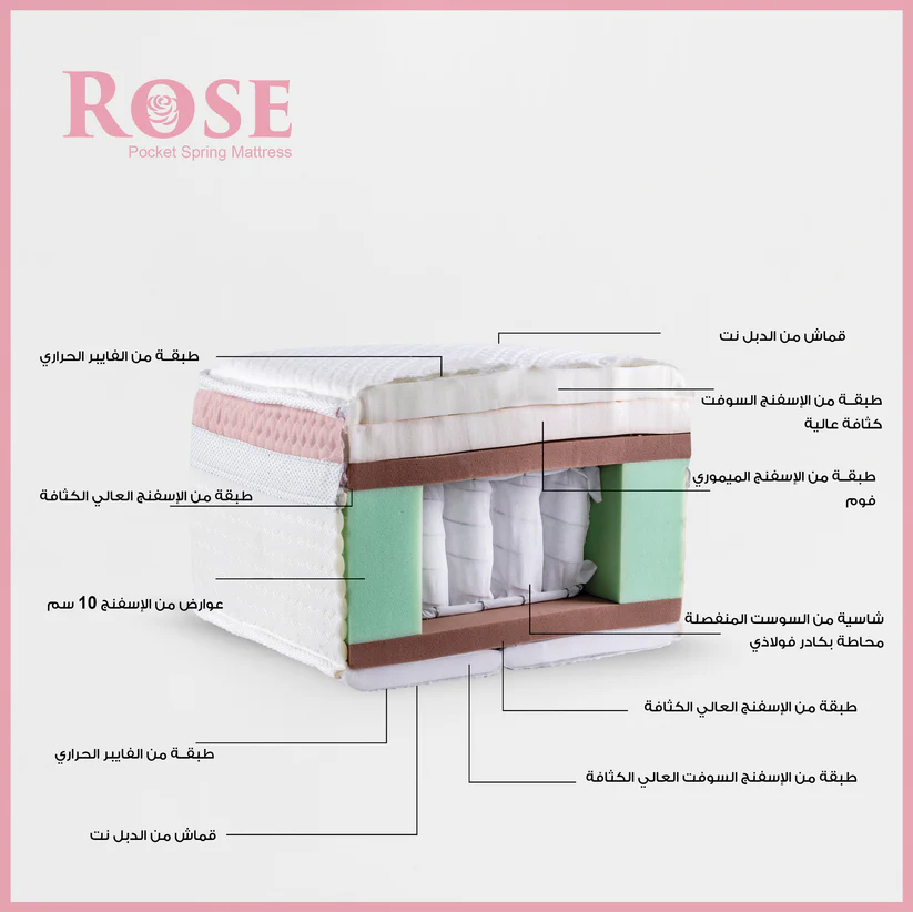 The mattress contains a chassis of pocket springs consisting of 260 springs per square meter almost made of treated steel, with a height of 18 cm, surrounded by a 5 mm wire from all directions to provide cohesion and strength to the chassis. It is covered with layers of non-woven fabric, moisture-insulating felt, and 4 cm thickness 30 from top side and sponge layers 2 cm thickness 26 from lower side . And 5 cm a layer of imported natural latex is added to it, and it is integrated with the mattress on the top side in Box top away .